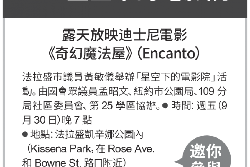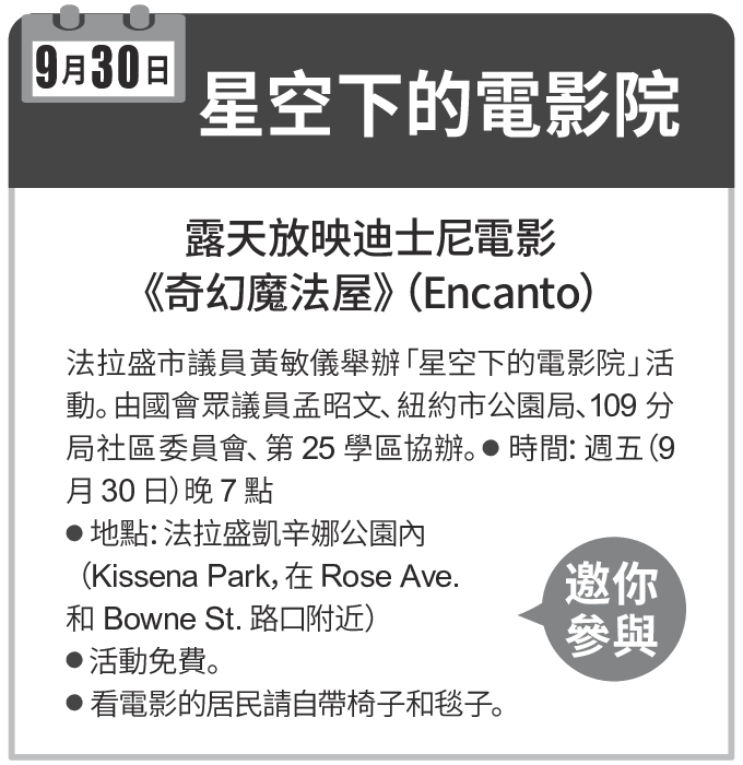 法拉盛市議員黃敏儀舉辦「星空下的電影院」活動。