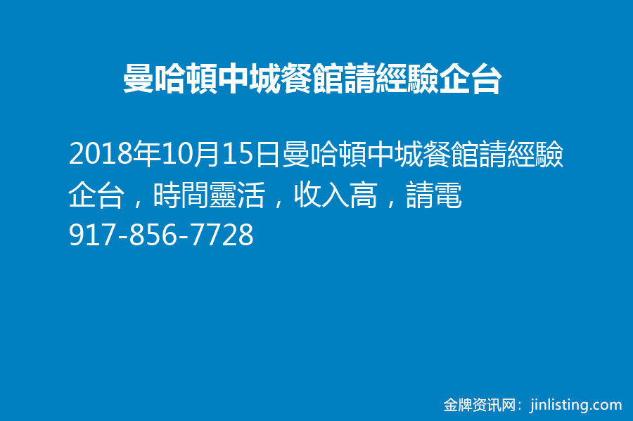 曼哈頓中城餐館請經驗企台,時間靈活,收入高,請電917-856-7728