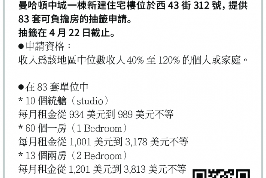 曼哈頓中城一棟新建住宅樓位於西43街312號,提供83套可負擔房的抽籤申請。
