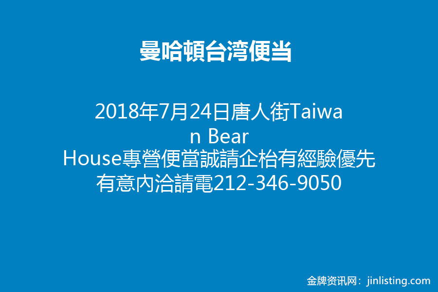 唐人街Taiwan Bear House專營便當誠請企枱有經驗優先 有意內洽請電212-346-9050