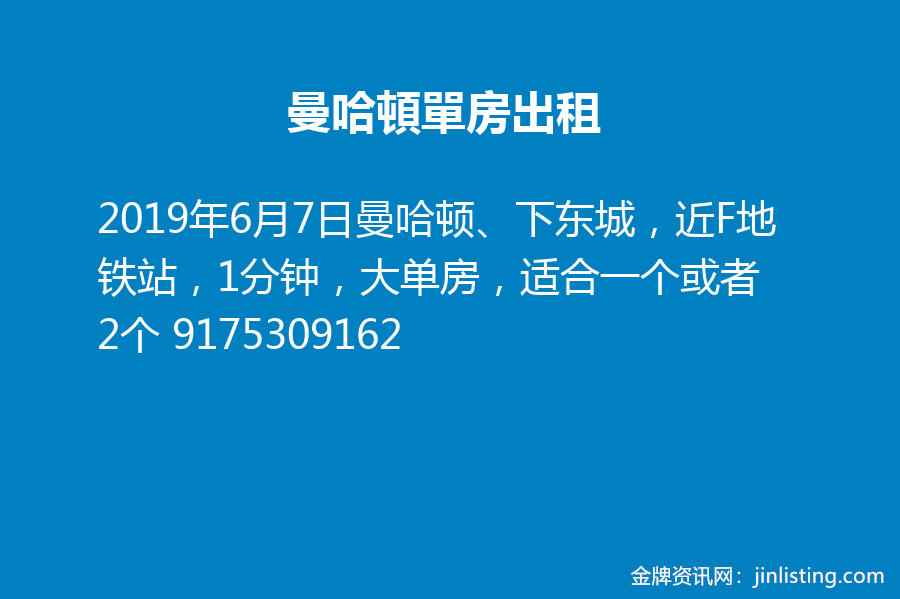 曼哈顿、下东城,近F地铁站,1分钟,大单房,适合一个或者2个 9175309162