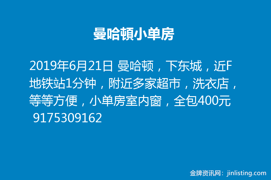 曼哈顿,下东城,近F地铁站1分钟,附近多家超市,洗衣店,等等方便,小单房室内窗,全包400元 9175309162