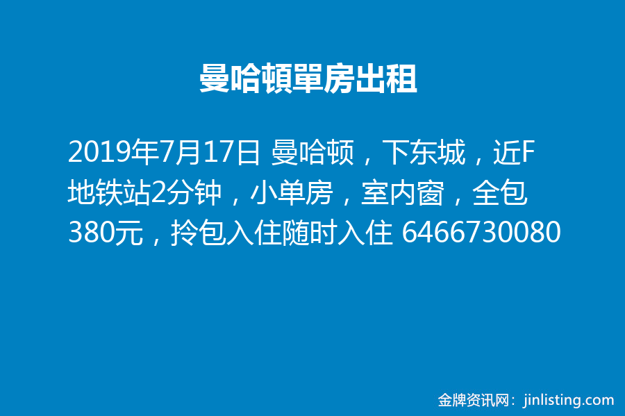 曼哈顿,下东城,近F地铁站2分钟,小单房,室内窗,全包380元,拎包入住随时入住 6466730080