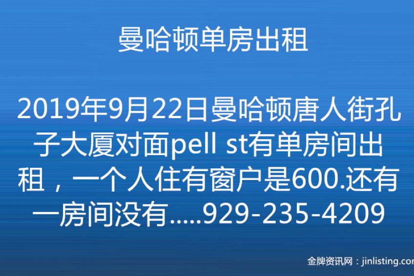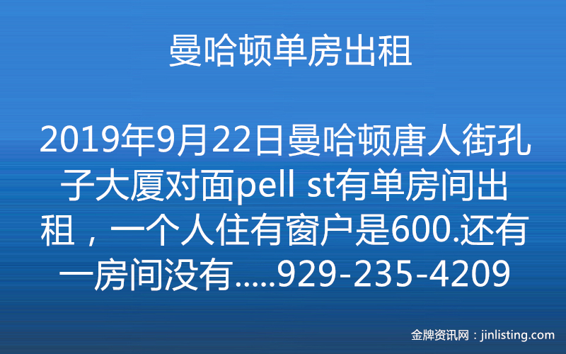 曼哈顿唐人街孔子大厦对面有单房出租 曼哈顿唐人街孔子大厦对面pell st有单房间出租,一个人住有窗户是600.还有一房间没有窗户是400,适合爱干净少炊烟的人士,近巴士和地铁站,治安好,请早上9:00过后来电或者信息,电话929-235-4209.谢谢