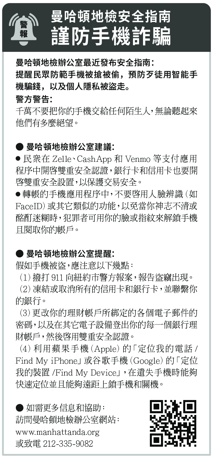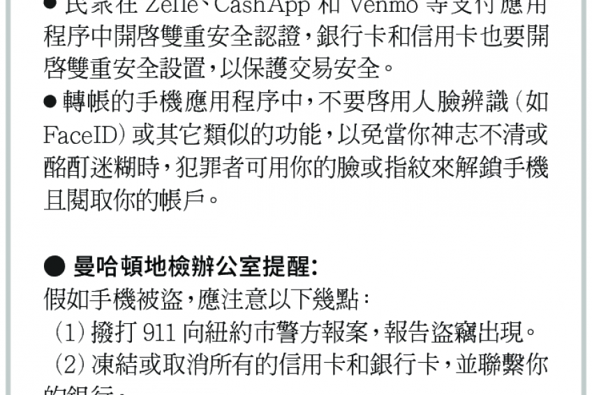 ● 民眾在Zelle、CashApp和Venmo等支付應用程序中開啟雙重安全認證,銀行卡和信用卡也要開啟雙重安全設置,以保護交易安全。
