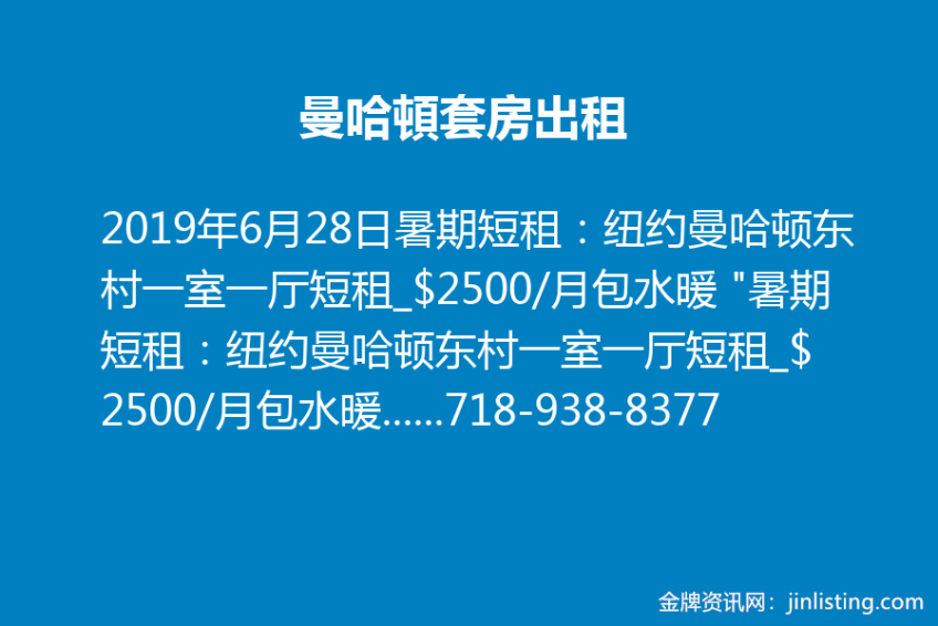 暑期短租:纽约曼哈顿东村一室一厅短租_$2500/月包水暖 “暑期短租:纽约曼哈顿东村一室一厅短租_$2500/月包水暖 @East 6st & 2nd Ave, 东村核心位置整套一室一厅出租,非常适合来纽约暑期实习和旅行的人入住。 租期:7/1-7/30/2019。可以带家具,包网络。 咨询看房Wendy 电话:718-938-8377微信:Q612597 邮件:wendy@taichirealty.com 公司网址:http://www.taichirealty.com”