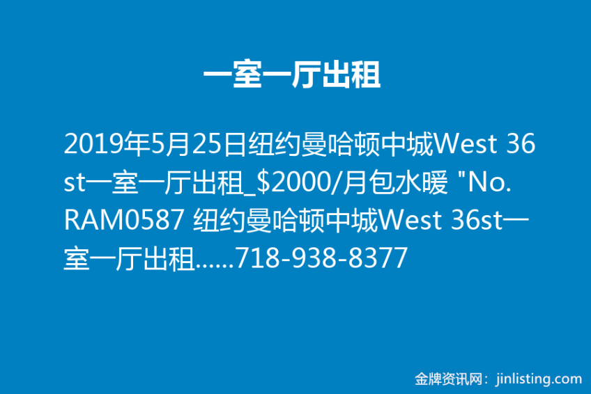 纽约曼哈顿中城West 36st一室一厅出租_$2000/月包水暖 “No.RAM0587 纽约曼哈顿中城West 36st一室一厅出租_$2000/月包水暖 @West 36st & 10th Ave, 近新地标哈德逊广场,近时代广场。 光线明亮,装修新,非常适合在附近工作的年轻人居住。 咨询看房Wendy 电话:718-938-8377微信:Q612597 邮件:wendy@taichirealty.com 公司网址:http://www.taichirealty.com”