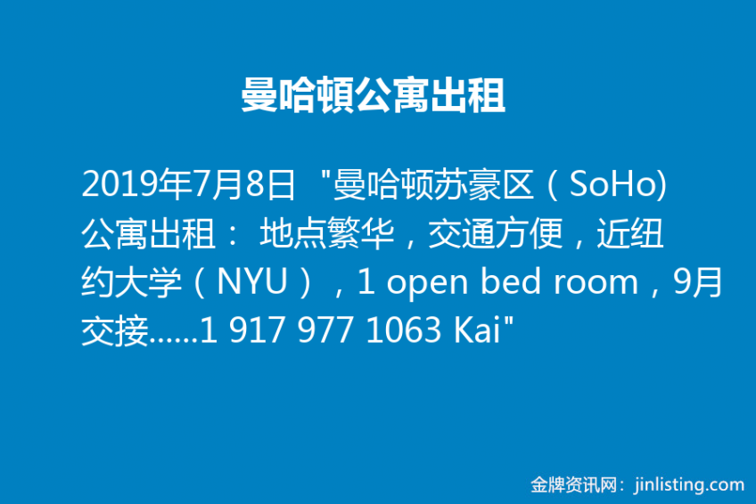 “曼哈顿苏豪区(SoHo)公寓出租: 地点繁华,交通方便,近纽约大学(NYU), 1 open bed room,9月交接,月租$2688!欢迎留学生查询, 有意者电联:1 917 977 1063 Kai”