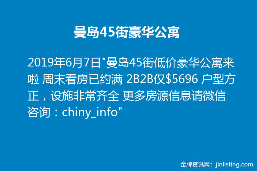 曼岛45街豪华公寓仅$5696 “曼岛45街低价豪华公寓来啦 周末看房已约满 2B2B仅$5696 户型方正,设施非常齐全 更多房源信息请微信咨询:chiny_info”