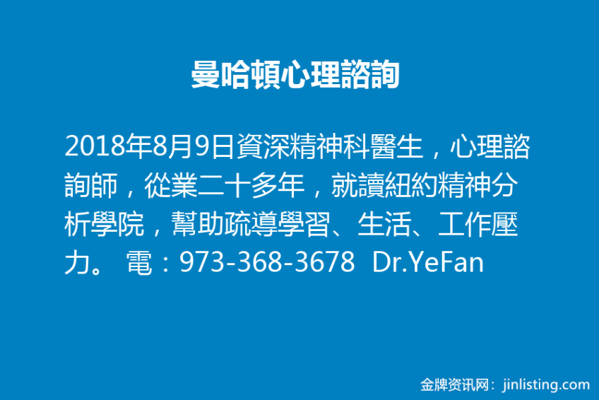 資深精神科醫生,心理諮詢師,從業二十多年,就讀紐約精神分析學院,幫助疏導學習、生活、工作壓力。 電:973-368-3678 Dr.YeFan 地址:345 7Ave (近Penn Station)
