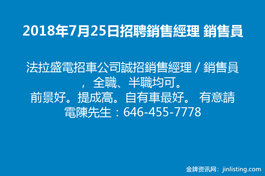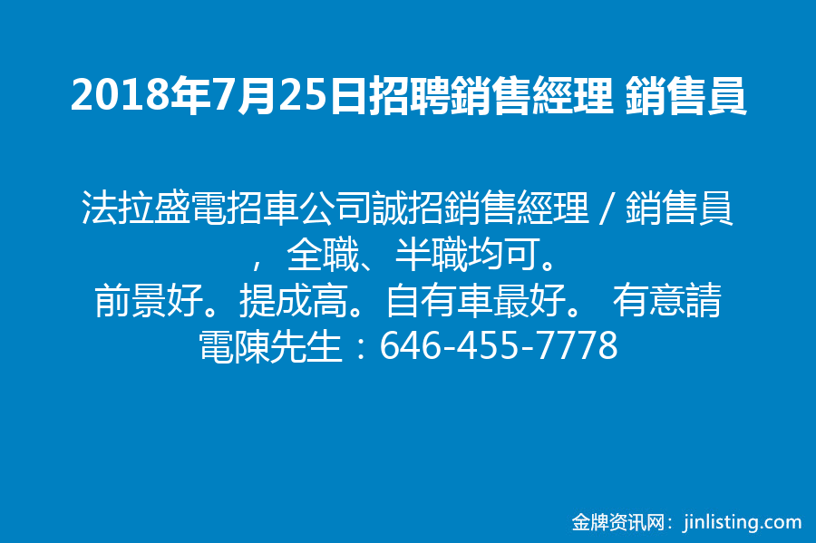 金麒麟電招車    法拉盛電招車公司誠招銷售經理/銷售員, 全職、半職均可。 前景好。提成高。自有車最好。 有意請電陳先生:646-455-7778