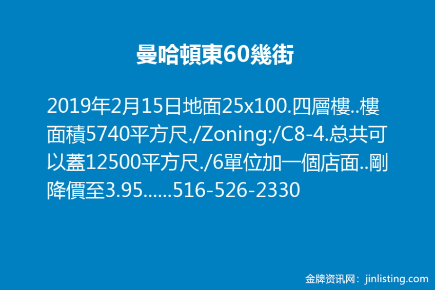 曼哈頓東60幾街..地面25×100.四層樓..樓面積5740平方尺./Zoning:/C8-4.总共可以蓋12500平方尺./6單位加一個店面..剛降價至3.95 mil..聯系安妮:516-526-2330