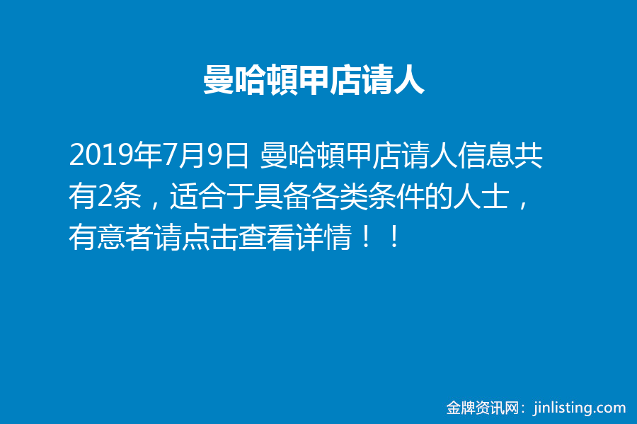 小工活拿大工工资,$125/天,$13.5/小时。曼哈顿高端指甲店招2年至5年熟练女小工。全职、兼职。 “近地铁(E、F、R、B、D、M、C、W), 薪水高,全职$13.5/小时,兼职$12/小时 over time $16.95/小时 日薪 $125/天。 收费高(普通手脚$70),高端客人,小费非常好! 上班时间10:50am—8:30pm 下班准时,不拖工 电话:9292451276”