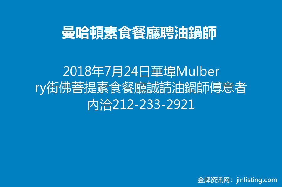 華埠Mulberry街佛菩提素食餐廳誠請油鍋師傅意者內洽212-233-2921