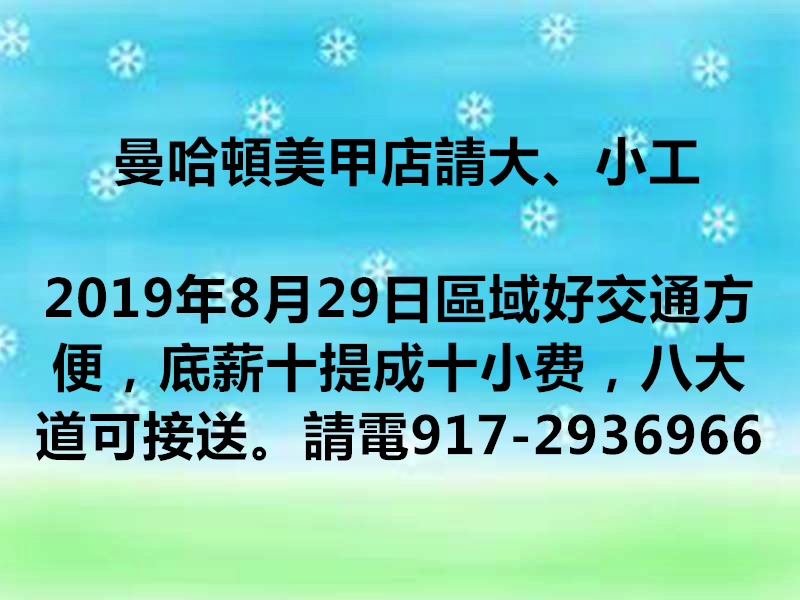 曼哈頓美甲店請大、小工,區域好交通方便,底薪十提成十小费,八大道可接送。請電917-2936966