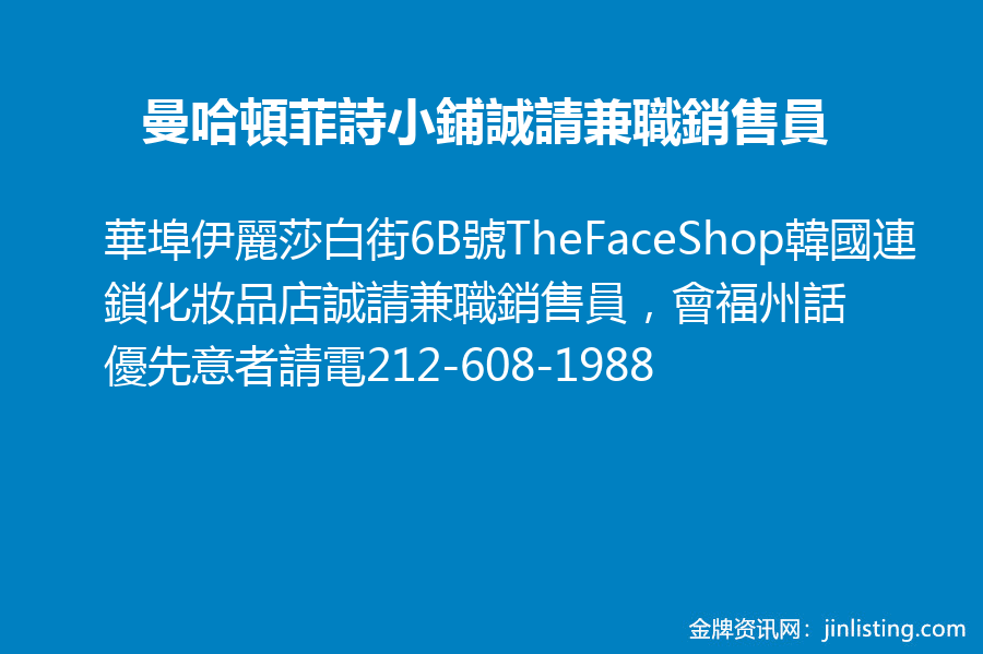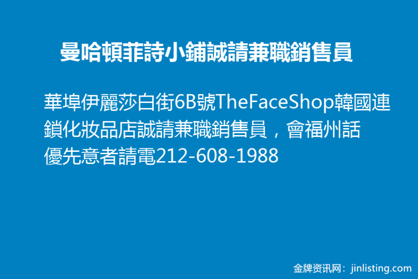 華埠伊麗莎白街6B號TheFaceShop韓國連鎖化妝品店誠請兼職銷售員,會福州話優先意者請電212-608-1988