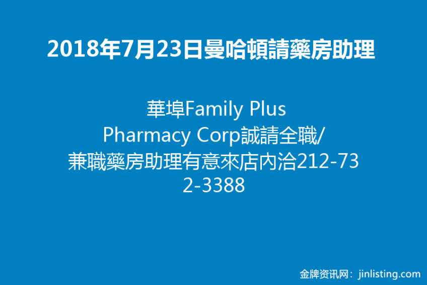 華埠Family Plus Pharmacy Corp誠請全職/兼職藥房助理有意來店內洽212-732-3388
