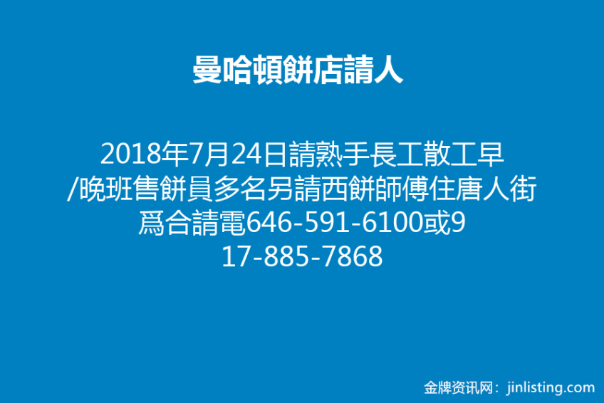 曼哈頓餅店請人  646-591-6100  917-885-7868