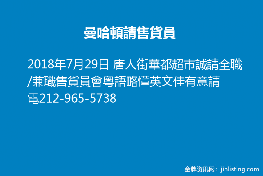 唐人街華都超市誠請全職/兼職售貨員會粵語略懂英文佳有意請電212-965-5738