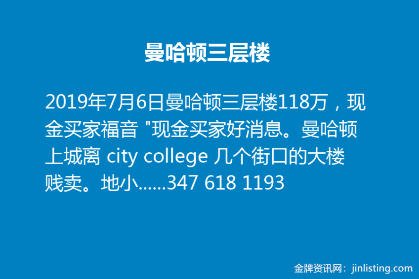 曼哈顿三层楼118万,现金买家福音 “现金买家好消息。曼哈顿上城离 city college 几个街口的大楼贱卖。地小,16×50,房不大,16×40,对习惯住在鞋盒尺寸的曼哈顿人来说,这个尺寸不小。地下2层,地上三层,这个地上三层楼相当与隔壁的五层楼(隔壁大楼是7层),地税才$4669/年。房内部被破坏的厉害,不能住人,只剩下一个空壳子了。必须必须全部装修才能恢复往日的威风。 需要了解详情,请短信丁丁@ 347 618 1193 或者加微信“纽约房”,21 世纪房产有大把房源供你挑”