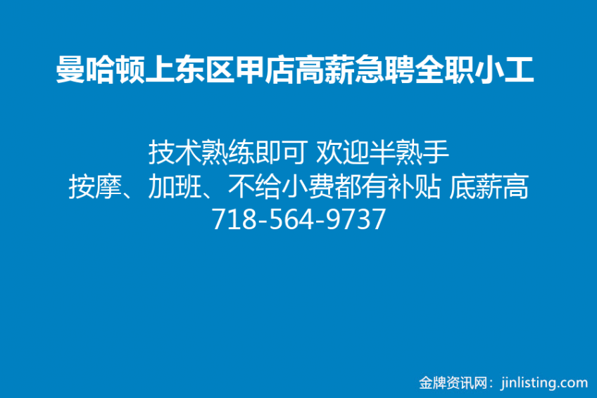 高薪急聘全职小工 曼哈顿上东区忙店 技术熟练即可 欢迎半熟手 按摩、加班、不给小费都有补贴 ,底薪高 老板人好 事少 店内关系和睦 718-564-9737