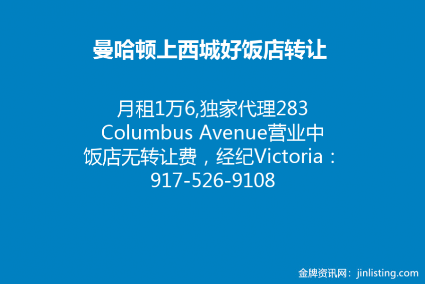 曼哈顿上西城好饭店月租1万6 “独家代理,283 Columbus Avenue, 营业中饭店,无转让费,月租1万6. 经纪Victoria: 917-526-9108”