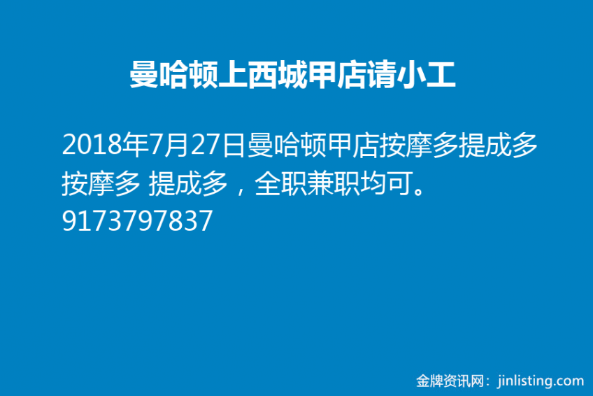 曼哈顿甲店按摩多提成多 曼哈顿上西城甲店请小工,按摩多提成多,全职兼职均可。9173797837