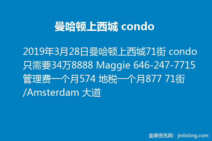 曼哈顿上西城71街 condo 只需要34万8888 Maggie 646-247-7715 管理费一个月574 地税一个月877 71街 /Amsterdam 大道