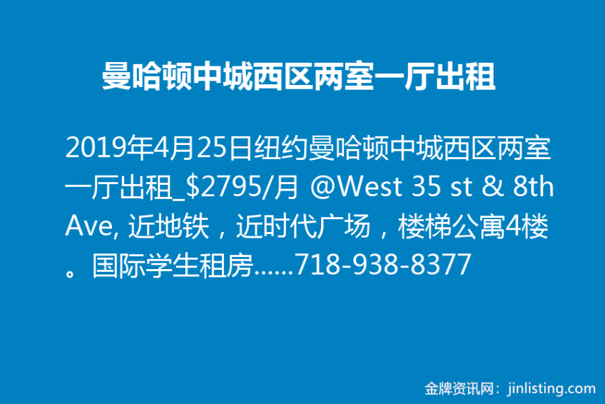 “No.RAM0662 纽约曼哈顿中城西区两室一厅出租_$2795/月 @West 35 st & 8th Ave, 近地铁,近时代广场,楼梯公寓4楼。 国际学生租房,付一押三即可。 免费预约看房,签约时付佣金。 Wendy 电话:718-938-8377微信:Q612597 邮件:wendy@taichirealty.com 公司网址:http://www.taichirealty.com”