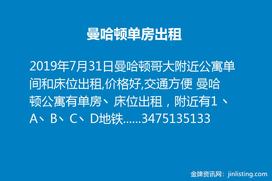 曼哈顿哥大附近公寓单间和床位出租,价格好,交通方便 曼哈顿公寓有单房丶床位出租,附近有1 丶A丶B丶C丶D地铁,到时代广场只需20分钟,楼下有多辆bus,可长丶短期出租,设备齐全, 快速WiFi,拎包入住! 联系电话:3475135133(可发短信,注明租房) 舒适的大床纯棉床品,让认床的你也能舒服的睡好觉,24小时热水,让你满满家的感觉,体验心灵在路上,身在“家”中。附近有中国餐,快餐店,炸鸡店,汉堡店,咖啡屋,酒吧, 图书馆,公园。 本人对购物有专长,可以推荐给你做好的都购物场所,如果需要可以给您做购物导游。保证让您以最少的价格,买到做满意的产品。