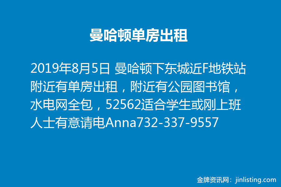 曼哈顿单房出租 曼哈顿下东城近F地铁站附近有单房出租,附近有公园图书馆,水电网全包,52562适合学生或刚上班人士有意请电Anna732-337-9557