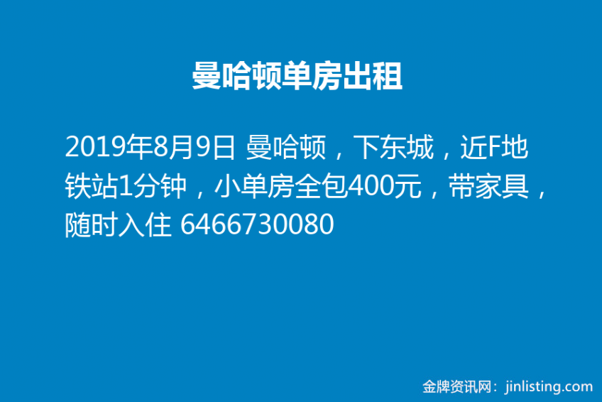 曼哈顿,下东城,近F地铁站1分钟,小单房全包400元,带家具,随时入住 6466730080