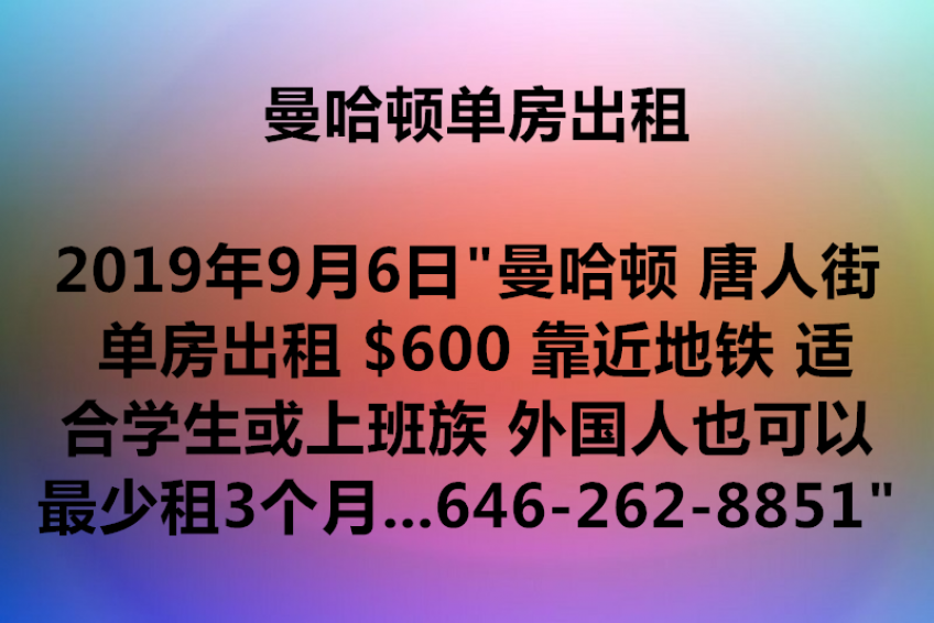 “曼哈顿 唐人街 单房出租 $600 靠近地铁 适合学生或上班族 外国人也可以 最少租3个月 有意请联系 646-262-8851”