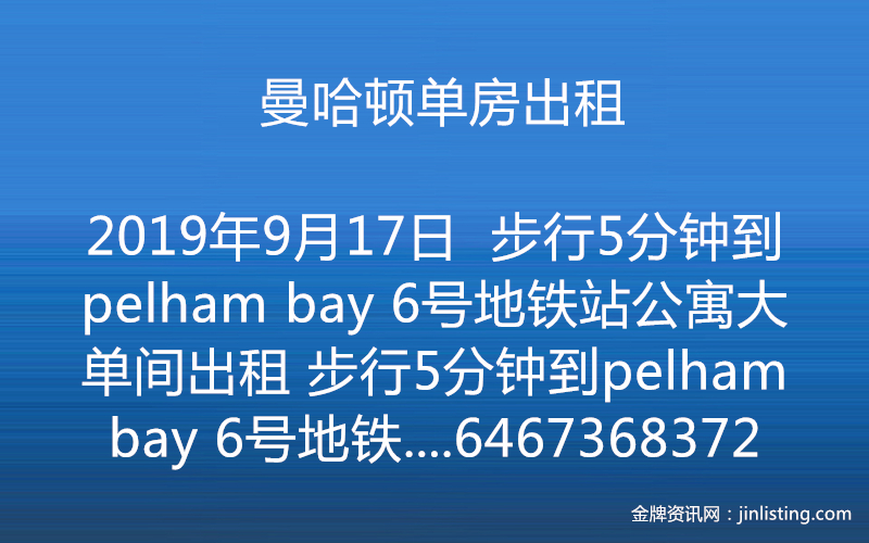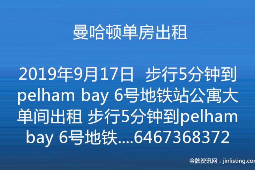 步行5分钟到pelham bay 6号地铁站公寓大单间出租 步行5分钟到pelham bay 6号地铁站、干净安静的漂亮公寓,房间超大近25平方米、朝向极好、去曼哈顿20分钟的车程、近50路公交,去法拉盛及为方便。一张车票可以去纽约上州、附近超级很多,停车方便,紧邻爱金斯坦医学院和医院,是你学习和生活的最佳选择。欢迎看房入住,请发短信6467368372