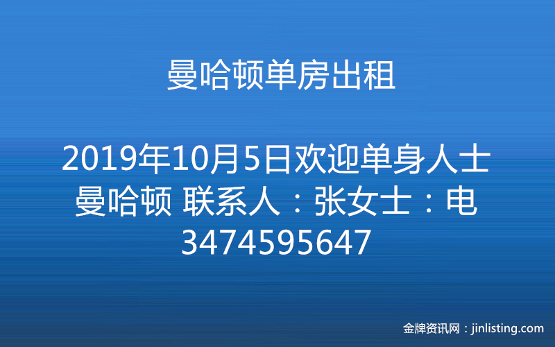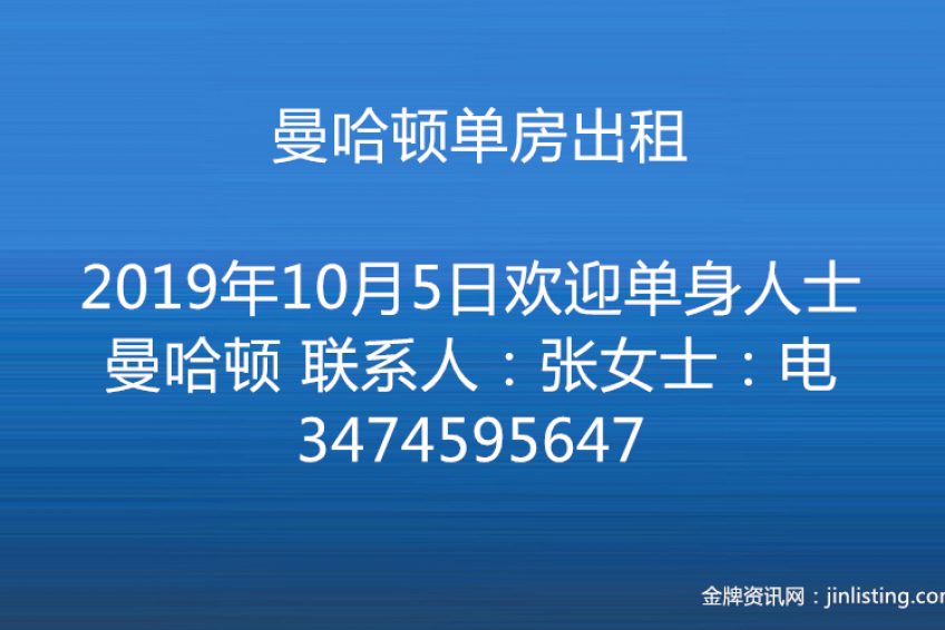 单房出租 欢迎单身人士 曼哈顿 联系人:张女士:电话3474595647