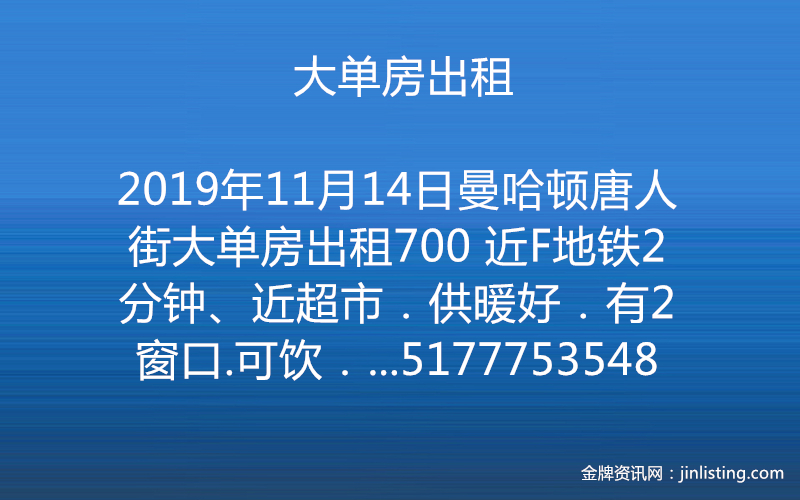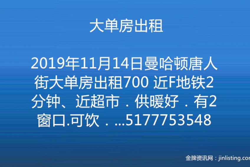曼哈顿唐人街大单房出租700 近F地铁2分钟、近超市.供暖好.有2窗口.可饮.可住二人。联系电话5177753548,有时忙没接请发信息、随时入住。