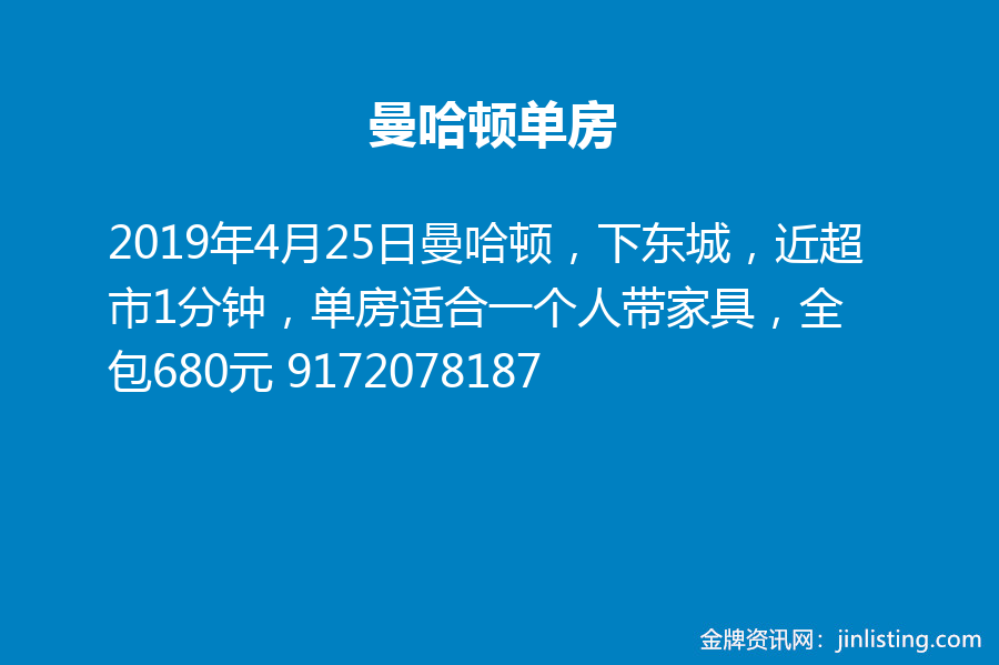 曼哈顿,下东城,近超市1分钟,单房适合一个人带家具,全包680元 9172078187