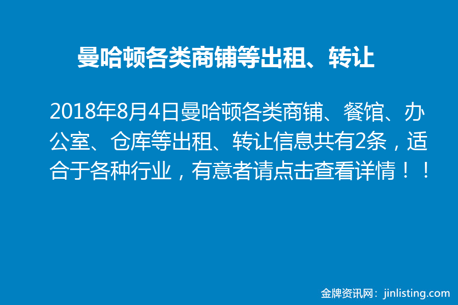 2、曼哈頓下城甲店出讓,十多年老店,全白人區,固定客源,5桌5池1拔毛房,700尺。年營業額40萬,房租$6400包地稅,還有3年約,到期後可續。有意請聯繫:929-888-9944