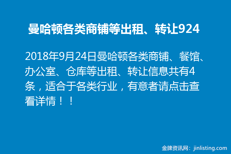 “按摩店转让: 曼哈顿57街,9~10大道间,4张床,四个人做工,生意火爆,无人管理,可打工看店。地铁A,C,B,D,1,N,Q,R,W线都到。电话 6467329522 面积:大概六七百尺。 位置:一楼临街店铺,黄金位置。 租约:签五年,还有三年半,是十多年的老店。 客人:每天25个左右客人,四人做工,员工休息的时候有part time 。 有诚意的打电话来,唠嗑的就别浪费彼此的时间了,都忙着赚钱呢,没空陪聊。”