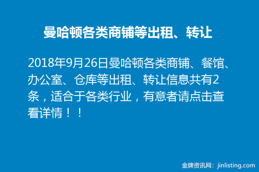 曼哈顿各类商铺、餐馆、办公室、仓库等出租、转让