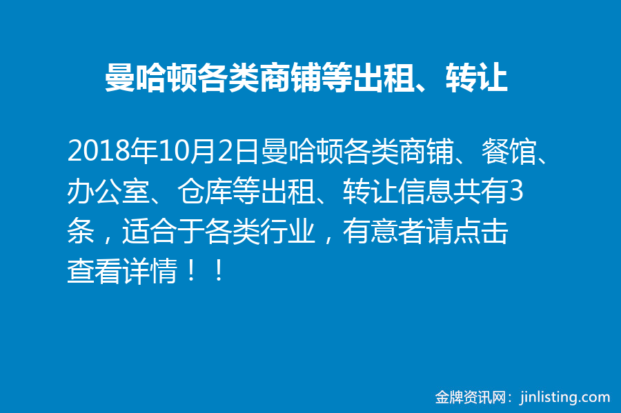 曼哈顿各类商铺、餐馆、办公室、仓库等出租、转让