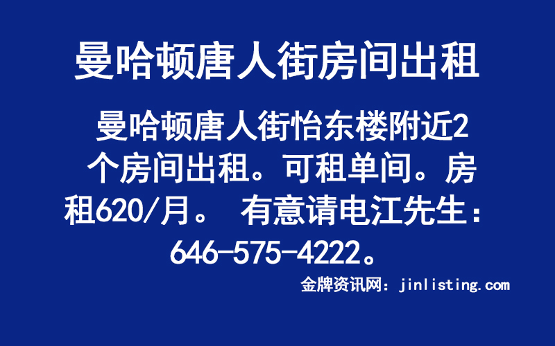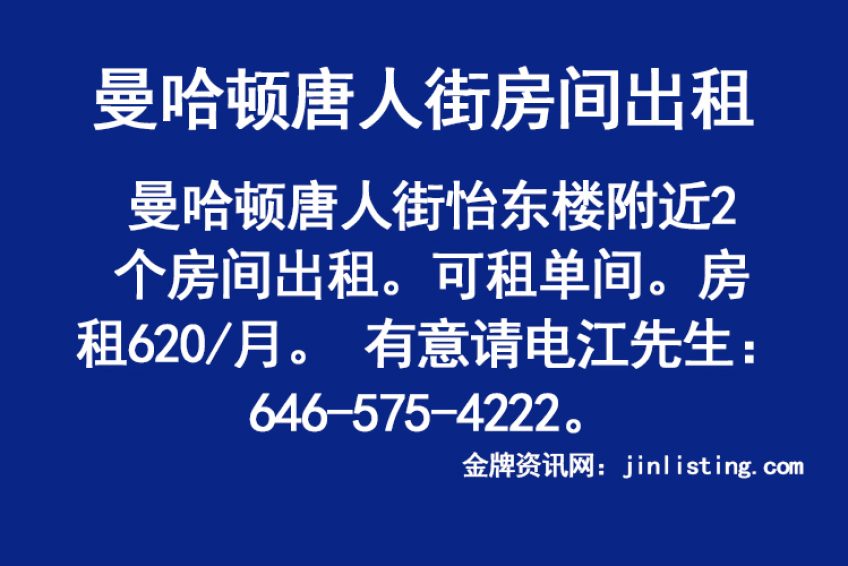 曼哈顿唐人街房间出租 曼哈顿唐人街怡东楼附近2个房间出租。可租单间。房租620/月。 有意请电江先生: 646-575-4222。
