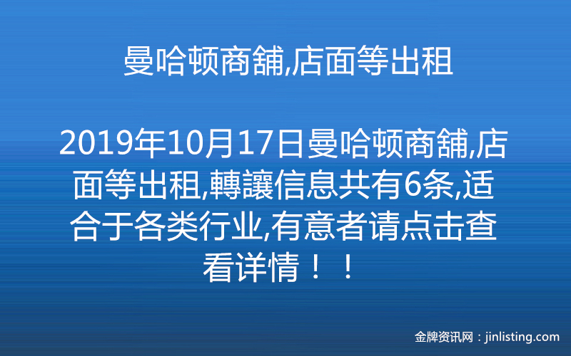 好价转让曼哈顿中城按摩老店,邻3个地铁站和中央公园转,老客多,小费高,还有近4年租约,接手就赚,房租3800,转让费37000(含底压金),因个人原因忍痛急转,签租约需看大牌执照。 9173463676