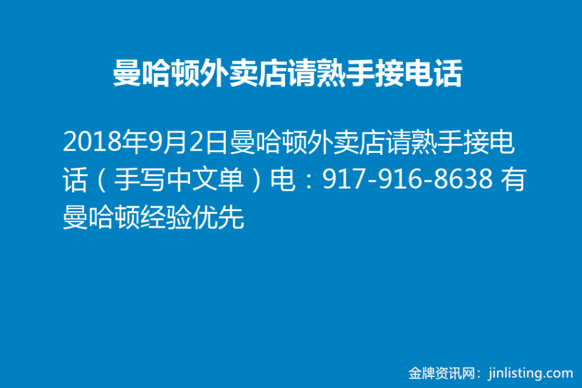 曼哈顿外卖店请熟手接电话(手写中文单)电:917-916-8638 有曼哈顿经验优先