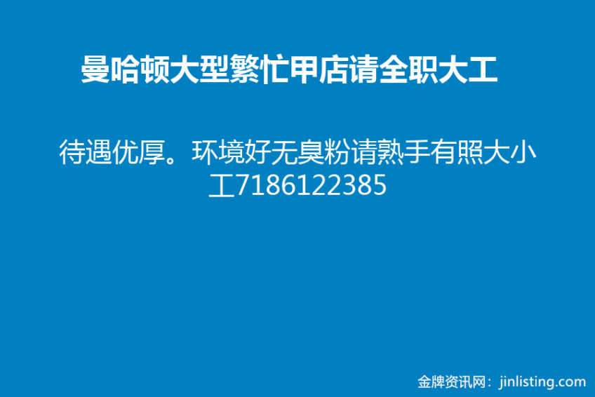曼哈顿大型繁忙甲店请全职大工待遇优厚。环境好无臭粉请熟手有照大小工7186122385