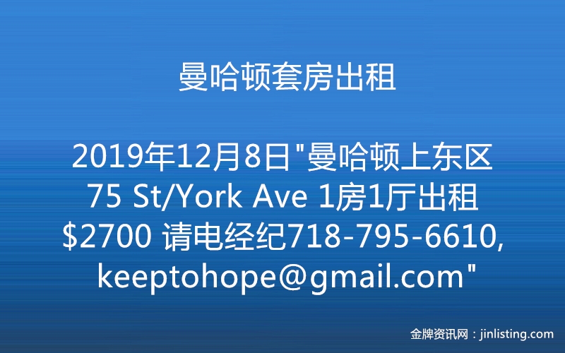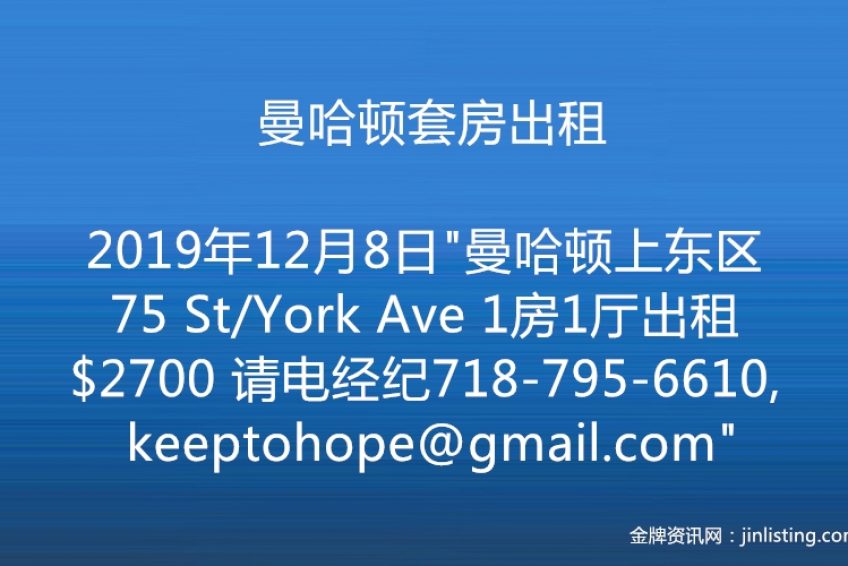 “曼哈顿上东区75 St/York Ave 1房1厅出租 $2700 请电经纪:718-795-6610, keeptohope@gmail.com”