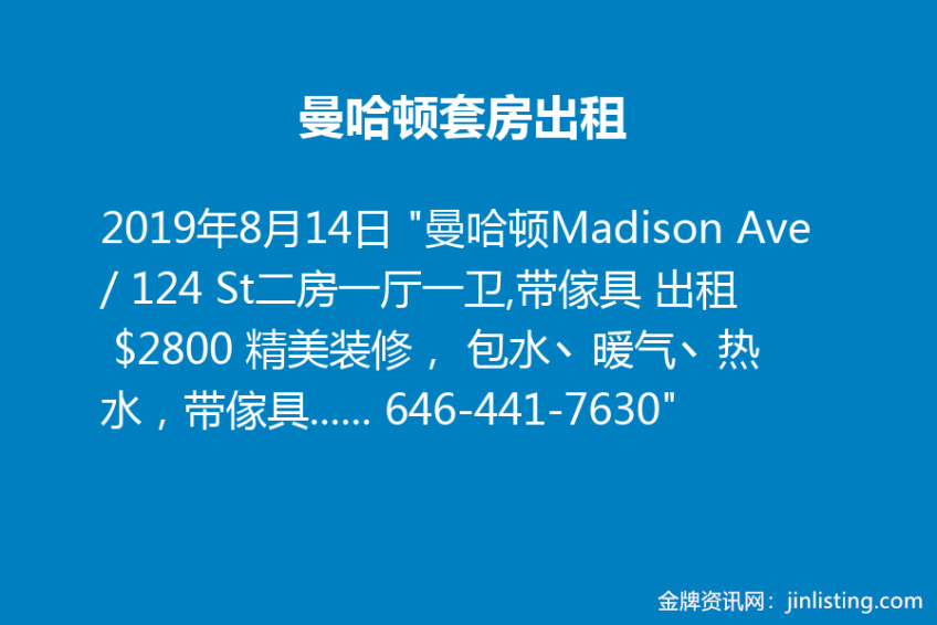 “曼哈顿Madison Ave / 124 St二房一厅一卫,带傢具 出租 $2800 精美装修, 包水丶暖气丶热水,带傢具, 易趴车,可以直接拎包入住 走五分钟到地鐵 #4, #5, #6, #2 & #3,交通便利,生活方便 有意者请电/短信 646-441-7630”