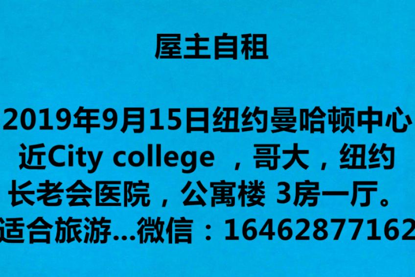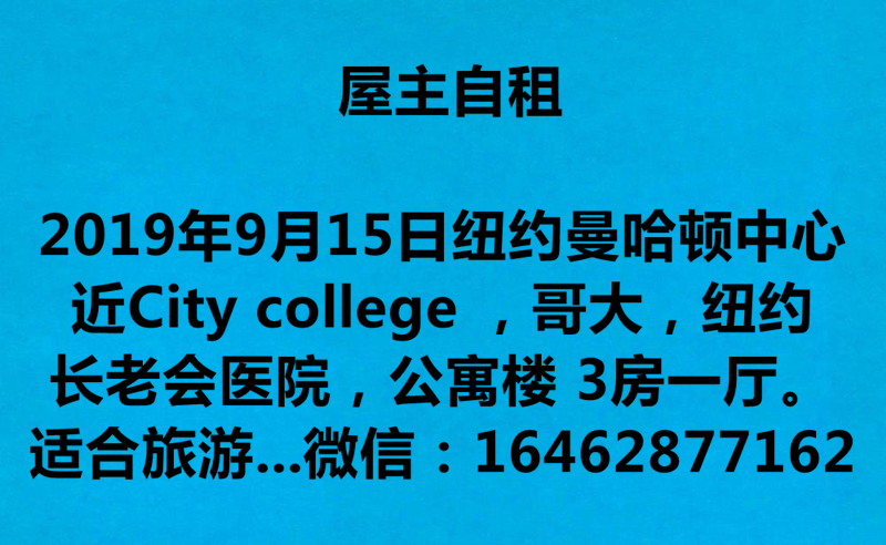 屋主自租 纽约曼哈顿中心近City college ,哥大,长短租$50 起 公寓楼 3房一厅。 “屋主自租 纽约曼哈顿中心近City college ,哥大,纽约长老会医院,公寓楼 3房一厅。 适合旅游,探亲,商务出差,留学,人士。 位置地处 纽约曼哈顿 1 号车 西137街站 , 出口1分钟到家。 3房一厅房间出租,房子是全新装修,屋里所以设施都是新的。厨房可以煮饭,周围环境优雅,旁边有公园,有银行,餐厅,24小时超市,应有尽有,所以不要担心任何问题,随时帮忙解决。 这个地区去市中心时代广场和帝国大厦只要15分钟。 免费配备:厨用具,房子有冷暖气,冰箱,热水壶,微波炉,烤箱,洗发水,淋浴露,吹风机,高速上网等等。 租金: 1人房:$ 80/天 $540/周 $1800/月 3个月以上$1200,6个月以上$1000 2人房: $50/天 /人 $340/周/人 $1100/月/ 如果有兴趣: 微信:16462877162 说明是City college house”
