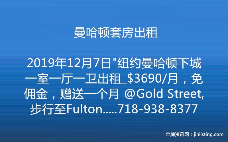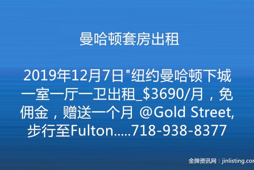 “纽约曼哈顿下城一室一厅一卫出租_$3690/月,免佣金,赠送一个月 @Gold Street,步行至Fulton地铁中心5分钟。 24小时门卫电梯公寓,一室一厅折后净价$3383/月含水暖煤。 免费使用楼内健身房,游泳池,活动室,图书馆。 另有两室一厅$6525,大统舱$2929/月。 现在租入,免佣金且赠送一个月。 免费咨询看房Wendy 电话:718-938-8377微信:Q612597 邮件:wendywendy2002@gmail.com 公司网址:http://www.taichirealty.com”