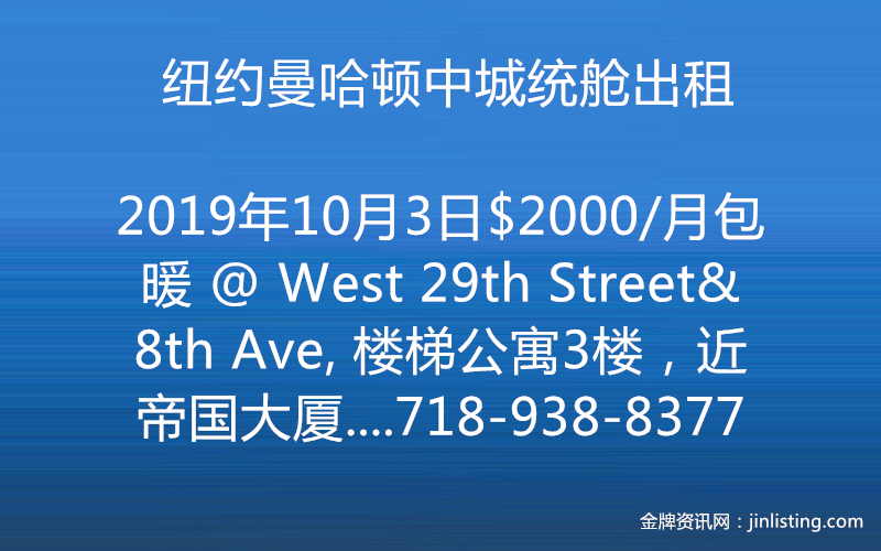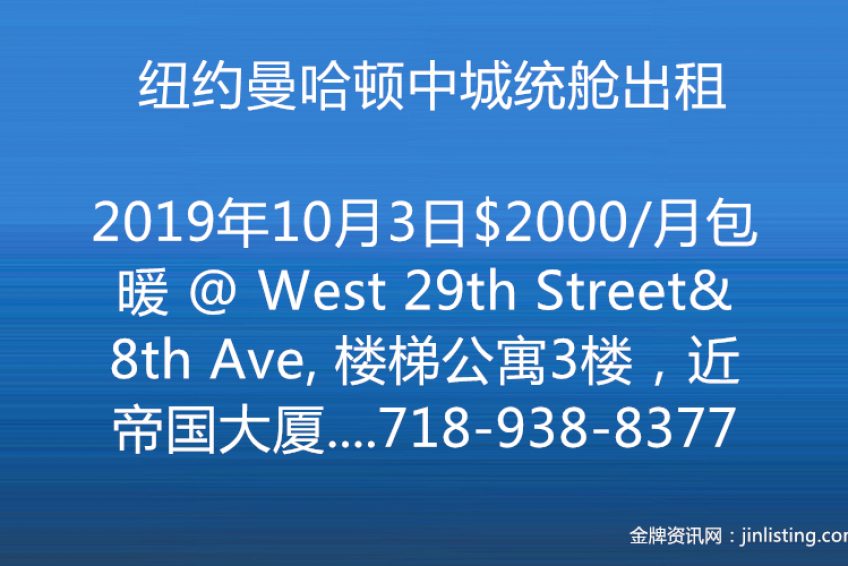“纽约曼哈顿中城统舱出租_$2000/月包水暖 @ West 29th Street& 8th Ave, 楼梯公寓3楼,近帝国大厦,和Path车站等。 光线明亮,装修新。 预约即可看房,可以马上入住。 咨询看房Wendy 电话:718-938-8377 微信:Q612597 邮件:wendy@taichirealty.com 公司网址:http://www.taichirealty.com”